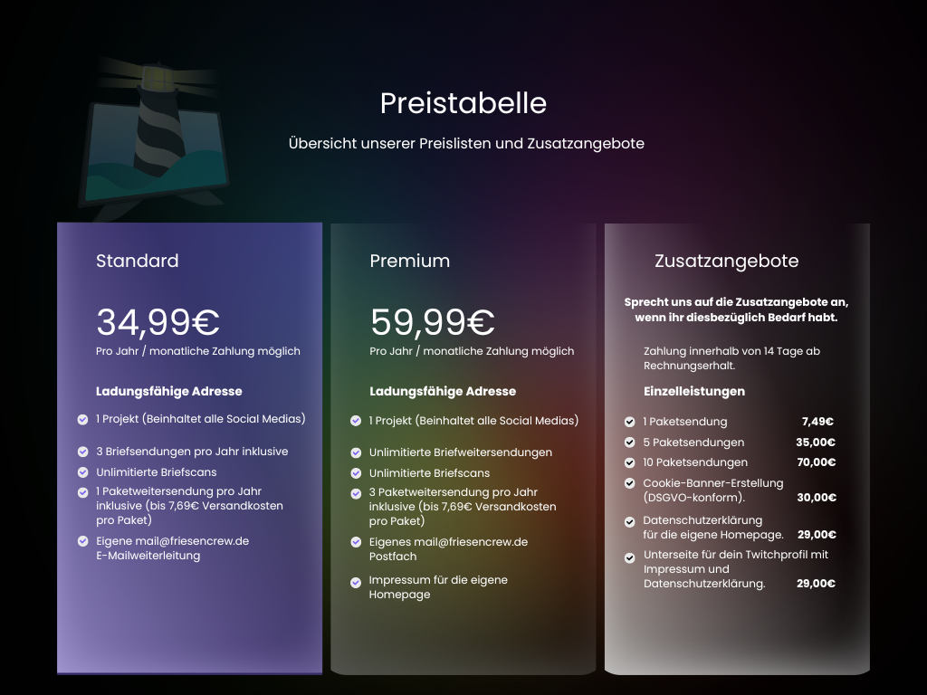 Im Impressum muss auch zwingend eine E-Mailadresse angegeben werden. Wer seine private E-Mailadresse nicht preisgeben möchte, kann unter Zusatzangebote ein E-Mailpostfach dazubuchen. Diese sieht dann wie folgt aus username@friesencrew.de. Ihr erhaltet dann Zugang über einen Webmailer. Die E-Mailadresse ist auch extern (z.b. Outlook, Thunderbird... ) nutzbar.